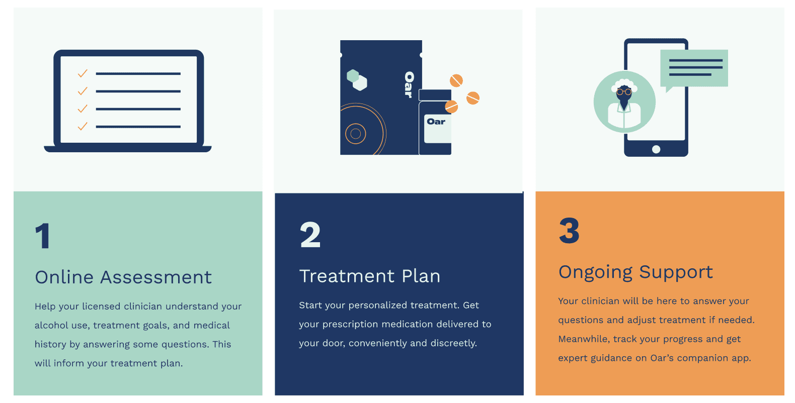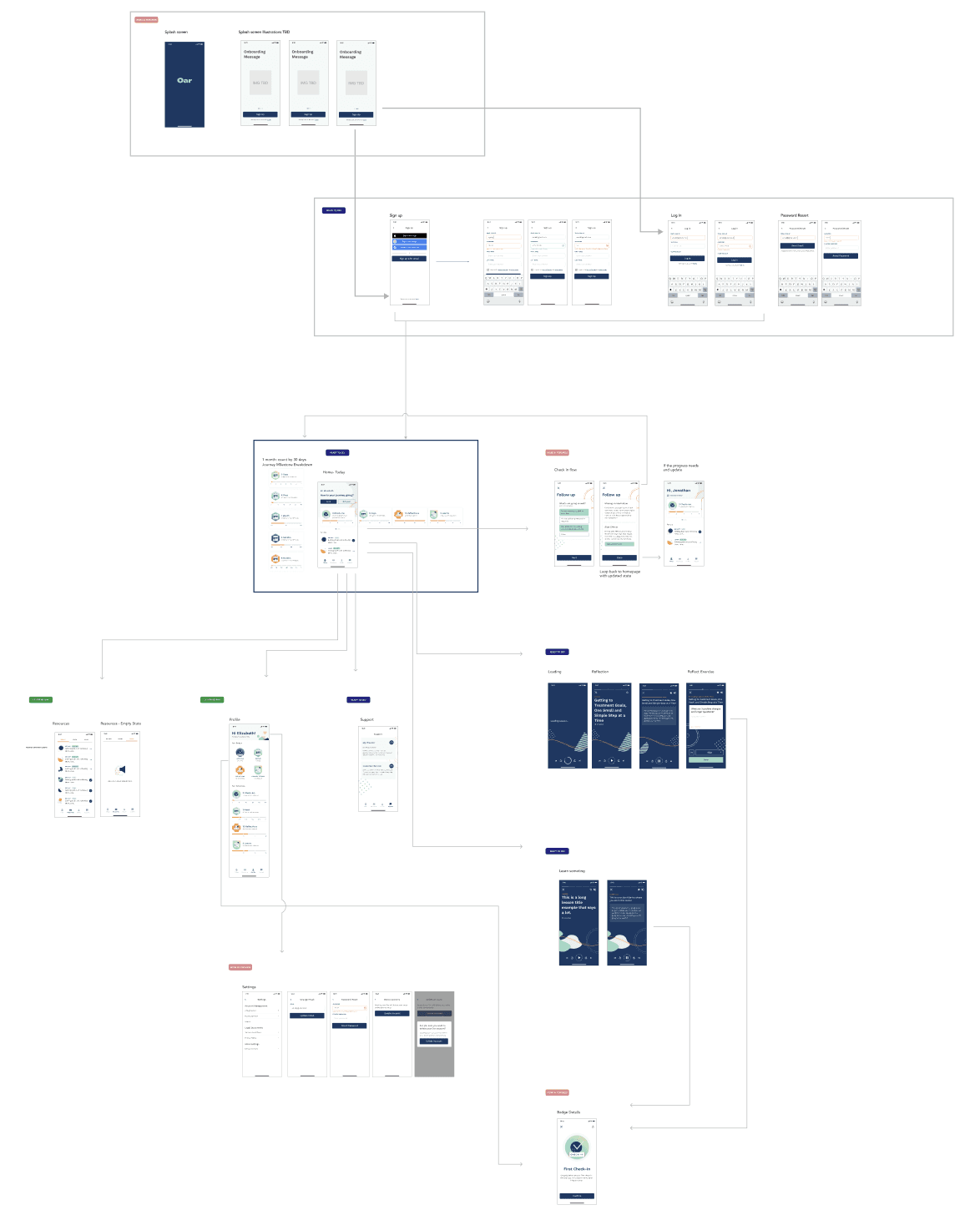A clear information architecture guides users through Oar’s companion app, providing a reliable, easy-to-use, and scalable experience that combines expert guidance with accessible, stigma-free care.