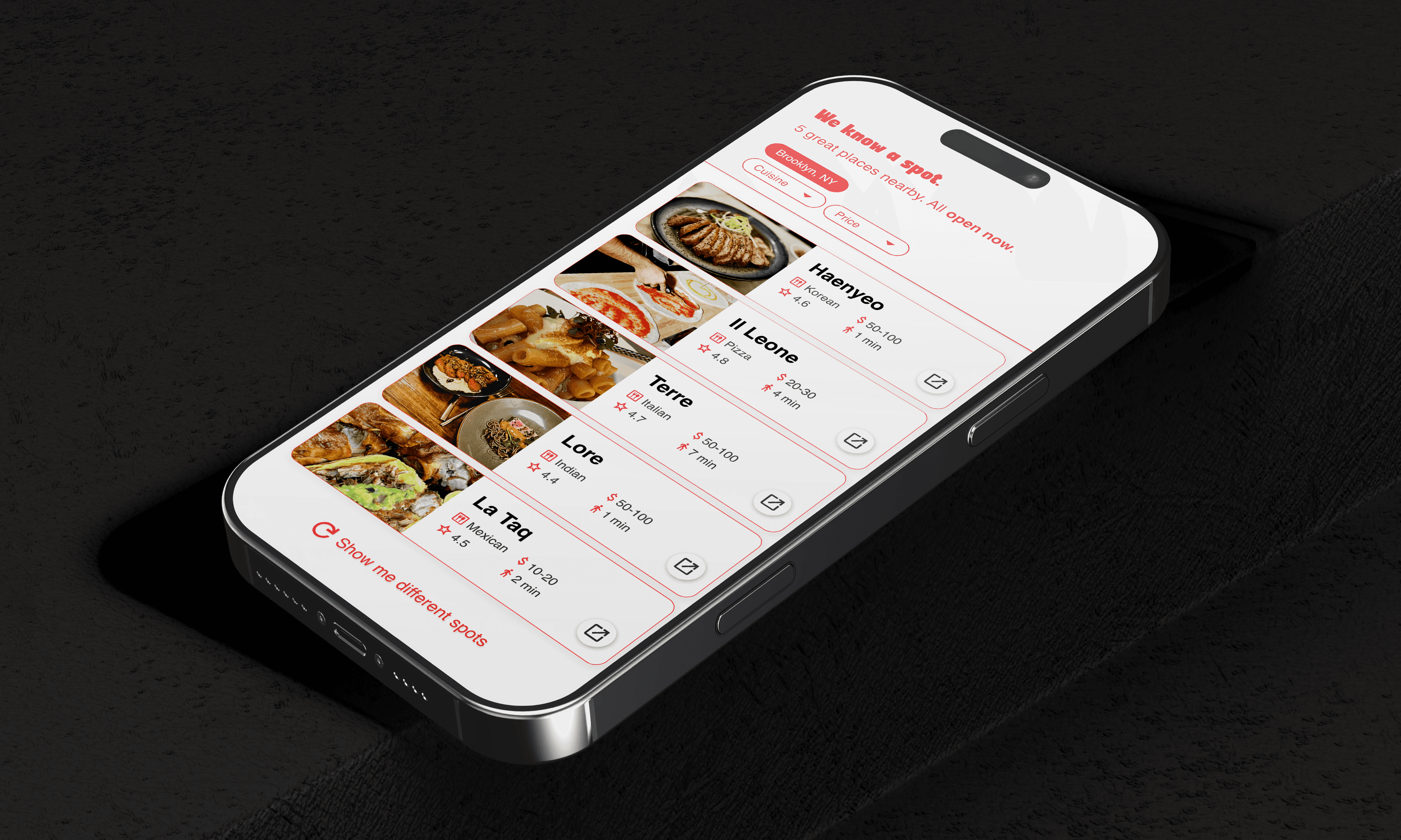 I’m the founder of Spot, a real-time restaurant discovery app I created to simplify choosing where to eat. I designed the experience to surface a small set of highly relevant restaurants based on proximity, availability, and quality, focusing on clarity, speed, and trust. I’m now independently developing the product with AI-assisted tools, aiming to launch on the App Store this year.