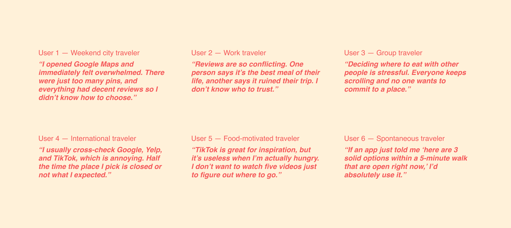 Finding a place to eat while traveling is frustrating and time-consuming. Endless lists, dense reviews, and conflicting opinions leave travelers stuck researching or settling for convenience over quality.
