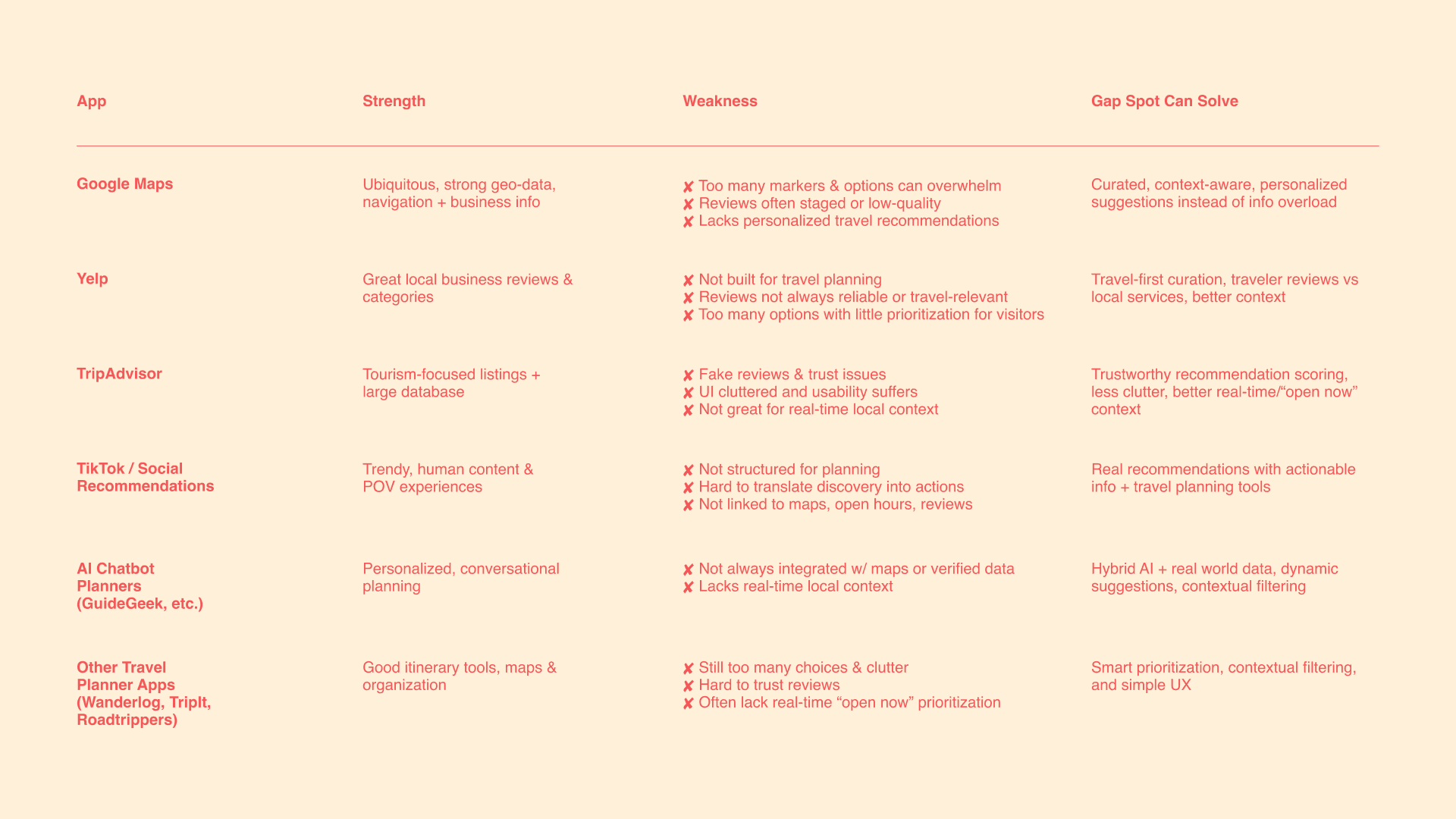 I conducted a competitive teardown to evaluate how existing platforms handle restaurant discovery in time sensitive moments. Across tools like Google Maps and Yelp, I found a consistent reliance on overwhelming choice and review heavy experiences optimized for exploration, not decision making. This revealed a clear opportunity to design for speed, trust, and reduced cognitive load.